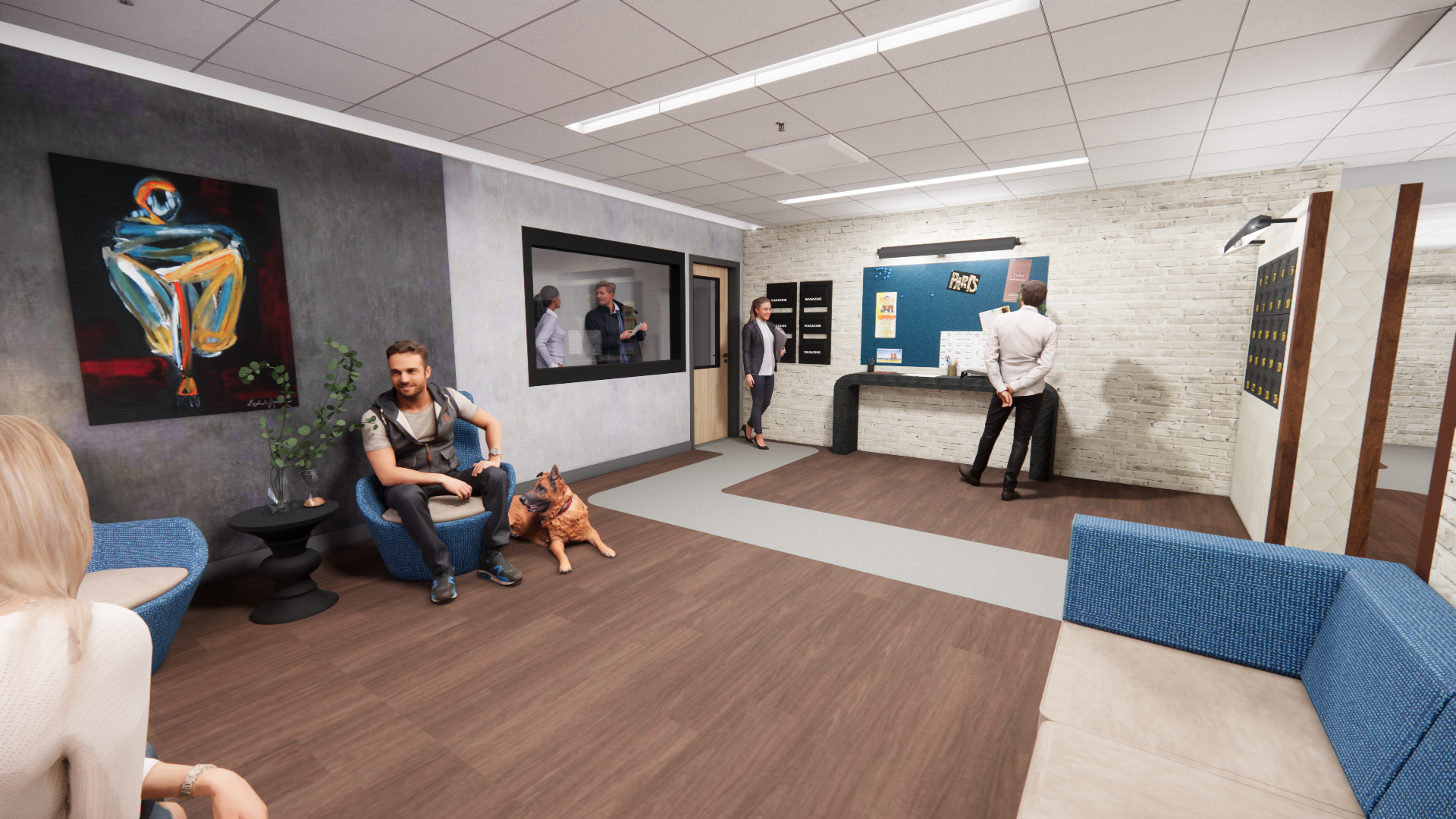 Lounge space includes different seating zones and contrasting walls that help for signing ASL