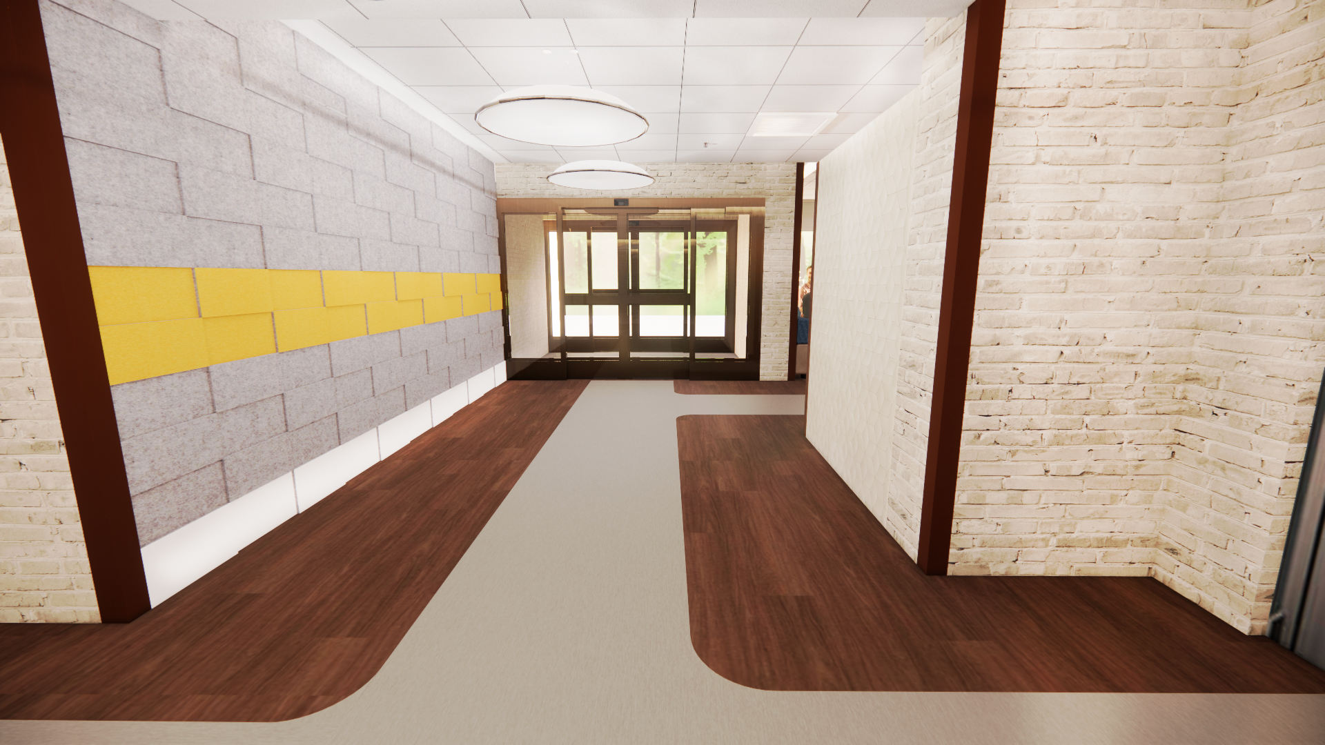 Entry/Exit includes many wayfinding techniques: the large wayfinding strip inset in the floor, the contrasting corner guards, the change in texture from brick to raised tiles, and the acoustic panel wall with yellow strip and bottom built-in lighting