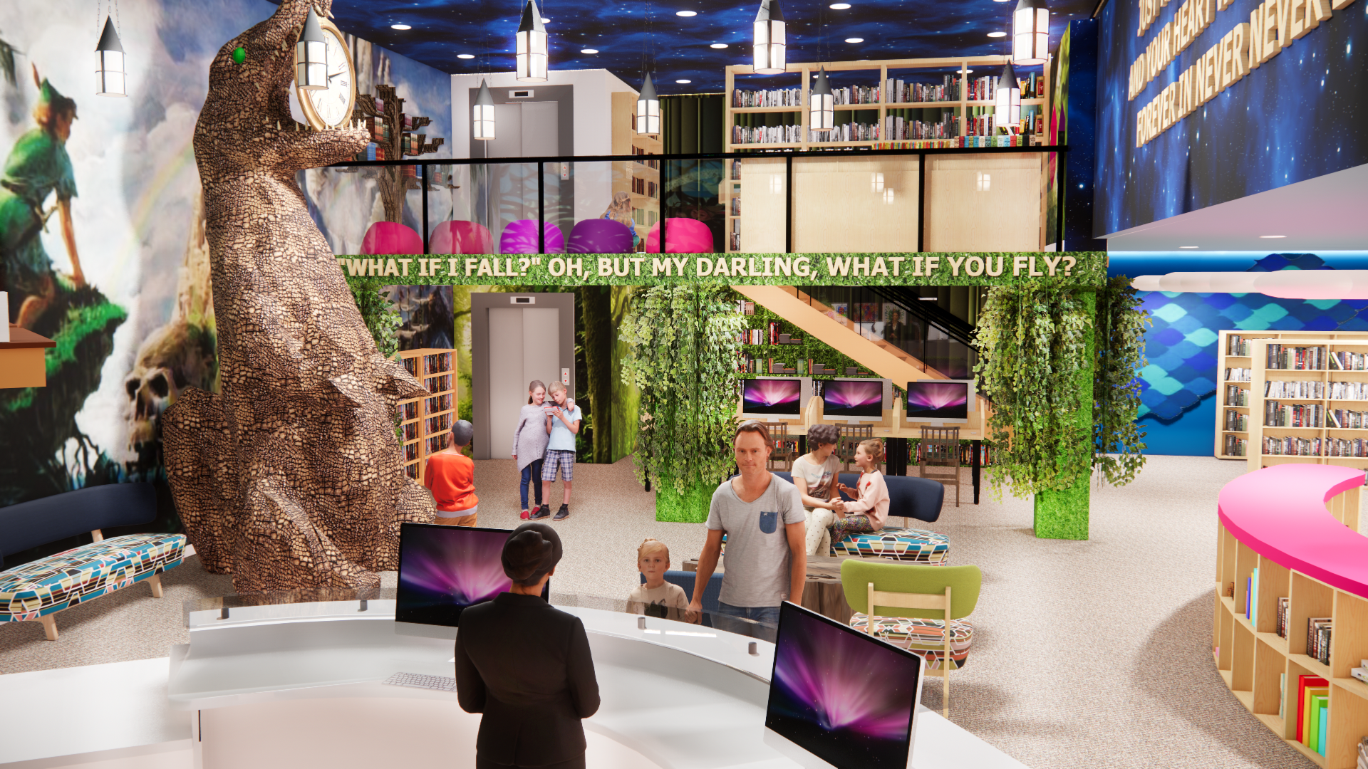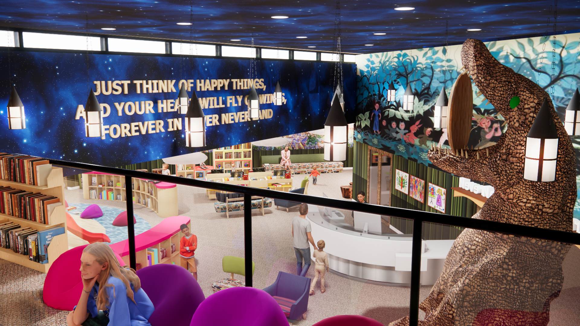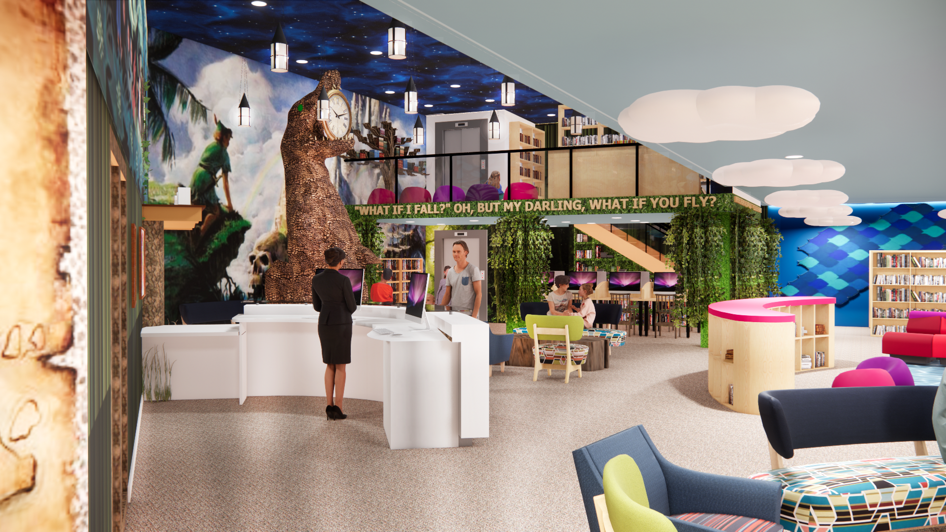 NeverNeverLand Library was created as a dreamland and haven for children to learn, socalize, and just be themselves. Built on the principals of fun, imagination, and never growing up, the redesigned Children’s Room will create an atmosphere of inspiration and whimsy, while fostering a strong interest in education and knowledge.