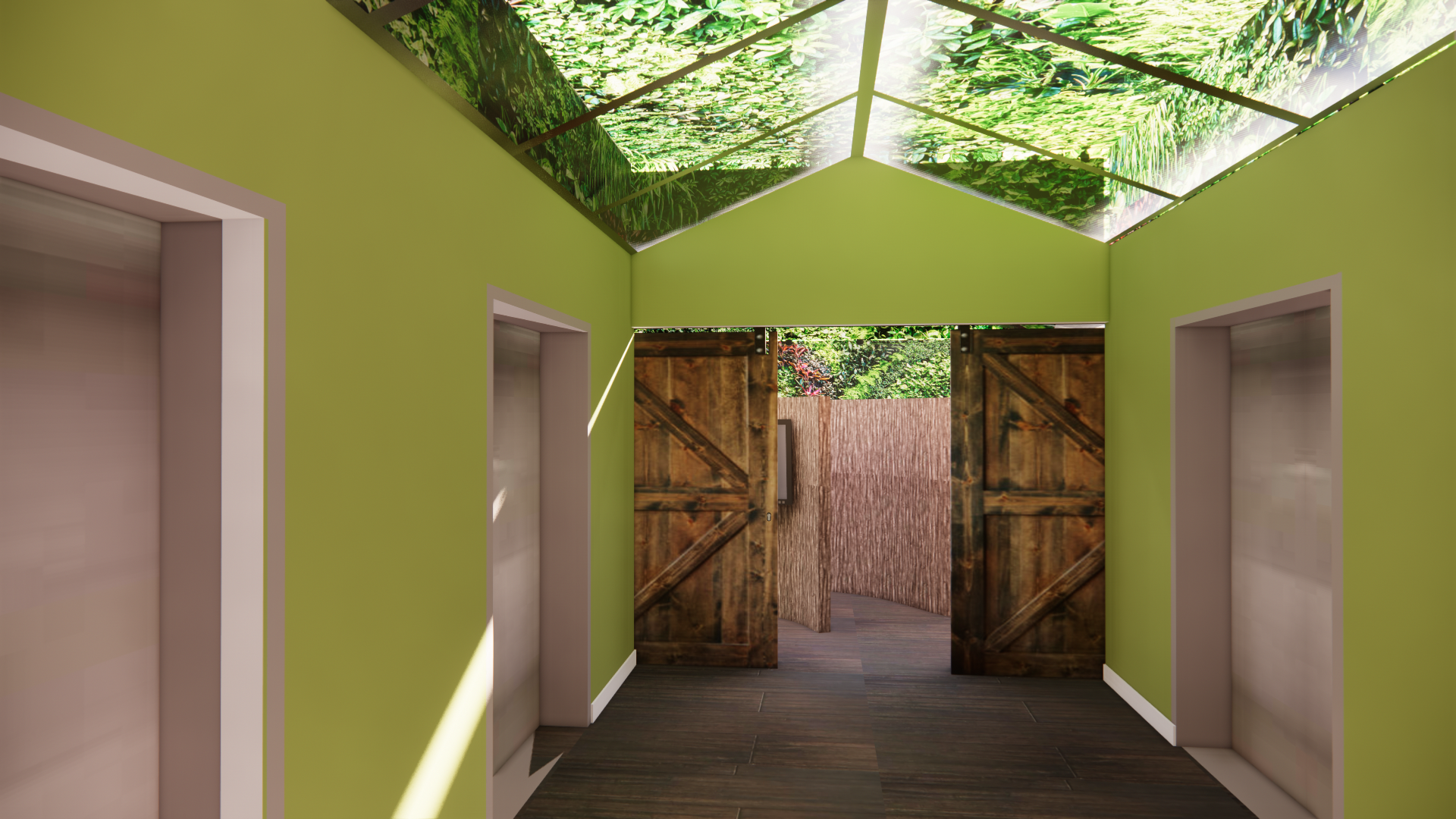 Upon entry to the space you are met with a large bark sculpture which you must walk through to get to reception. This was put in place to make visitors stop and realize the maze they must navigate in order to reach sustainability.