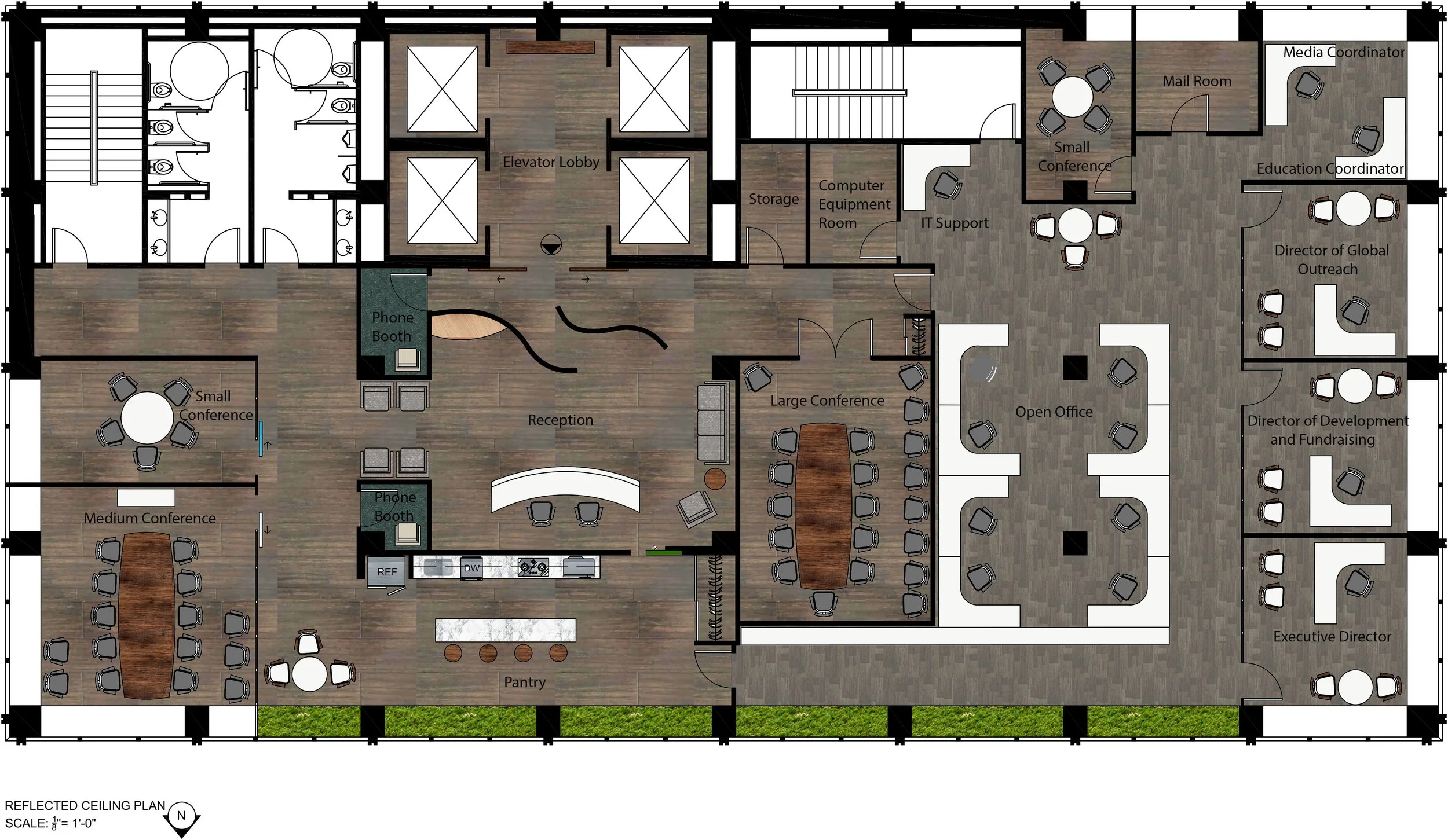The objective for this project was to create an office with the particular requirements for the non-profit Rainforest Alliance, which revolved around normal work and fundrasing.